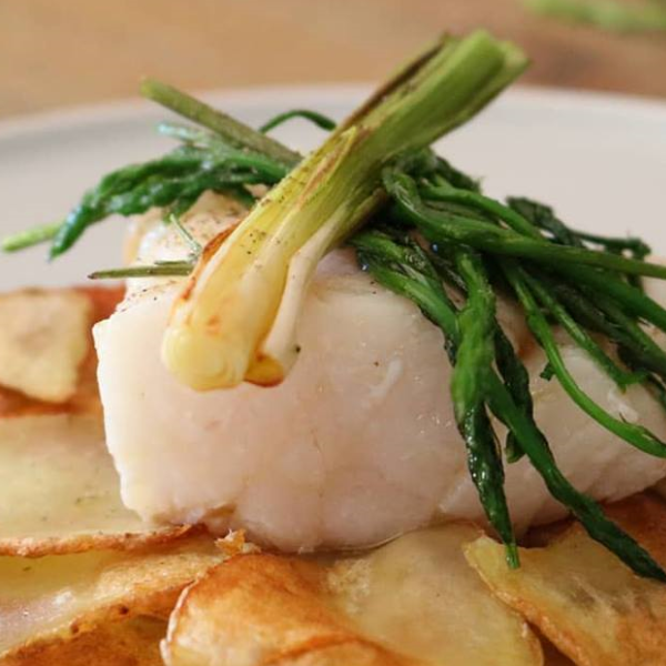 Bacallà confitat amb alls tendres i espàrrecs de marge