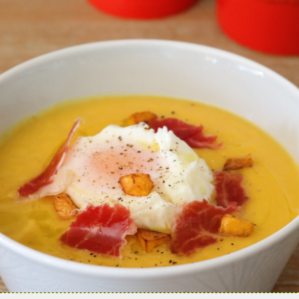 - Repartiu la crema als plats, col·loqueu-hi l’ou poché i amaniu amb sal, pebre i oli d’oliva. Decoreu amb els dauets de carbassa saltejats i opcionalment podeu acompanyar-ho d’encenalls de pernil.