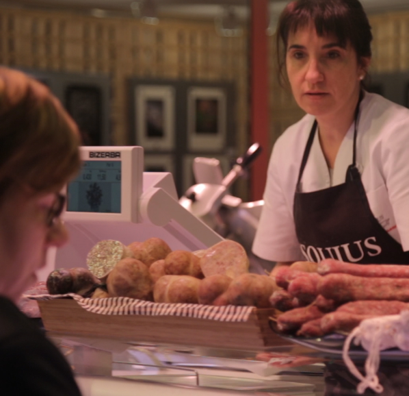 Montse Esquius posa com a exemple la botifarra crua, que cada setmana elaboren amb un o dos ingredients diferents. Esquius explica que “depèn molt de l’època de l’any, però els clients jo ho esperen i pregunten aquesta setmana de què l’has fet?”.