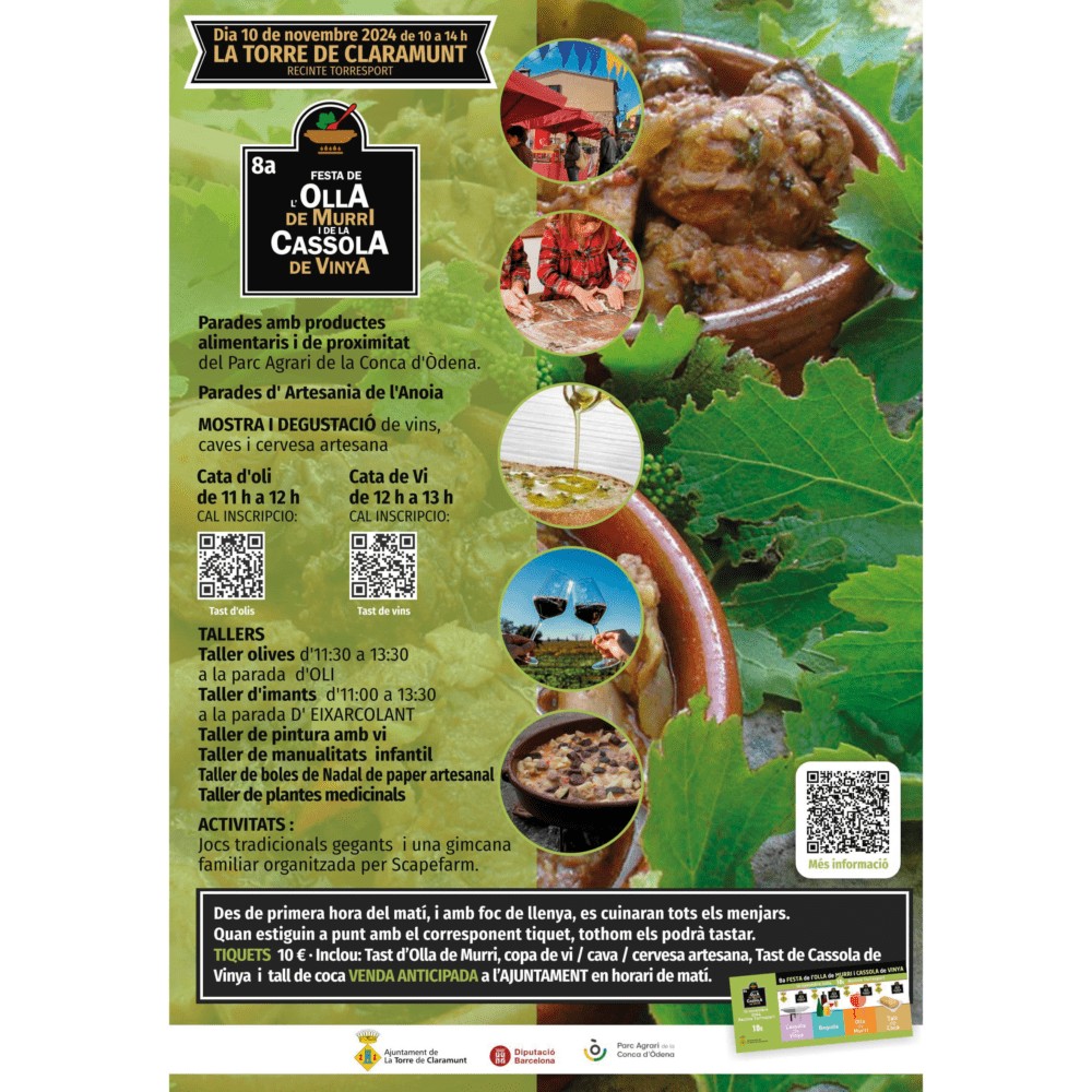 La Torre de Claramunt celebra la 8a Festa de la Cassola de Vinya, una nova jornada festiva lligada al poble, a la seva gastronomia, cultura i tradició. Serà el proper diumenge 10 de novembre, de 10 a 14 hores, al Recinte Torresport.