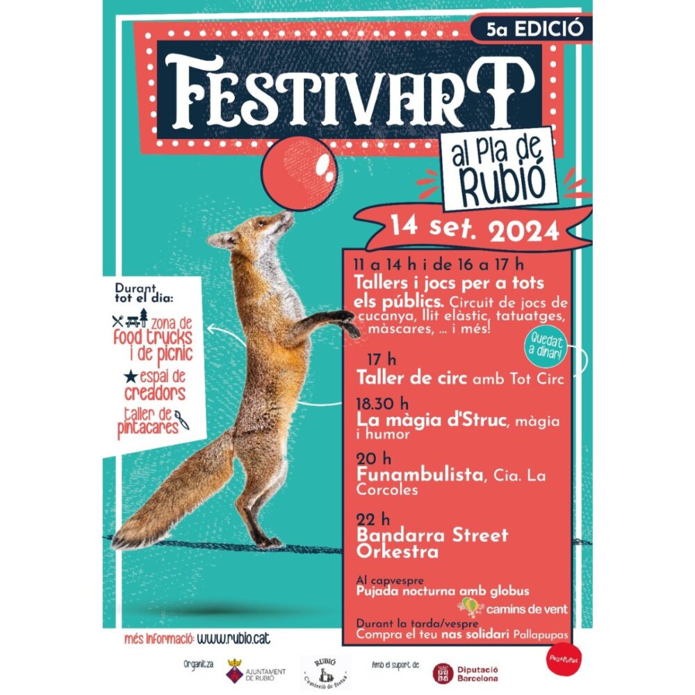 El dissabte 14 de setembre, Rubió celebra la cinquena edició del Festivart, el festival d’arts escèniques de Rubió, amb activitats i actuacions per a tota la família.