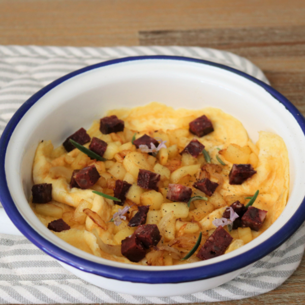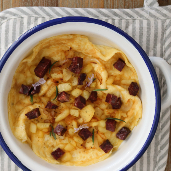 Truita oberta amb botifarra negra, poma i ceba caramel·litzada