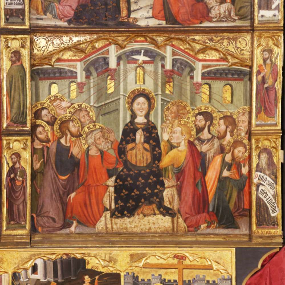 Las escenas de gozo, descritas de arriba a abajo, son: en el cuerpo lateral izquierdo, la asunción coronada por el profeta Isaías, la Natividad y la Epifanía; en el cuerpo lateral derecho, la Resurrección coronada por el profeta David, la Ascensión y el Pentecostés; y en la parte baja del cuerpo central, la Coronación de la Virgen.