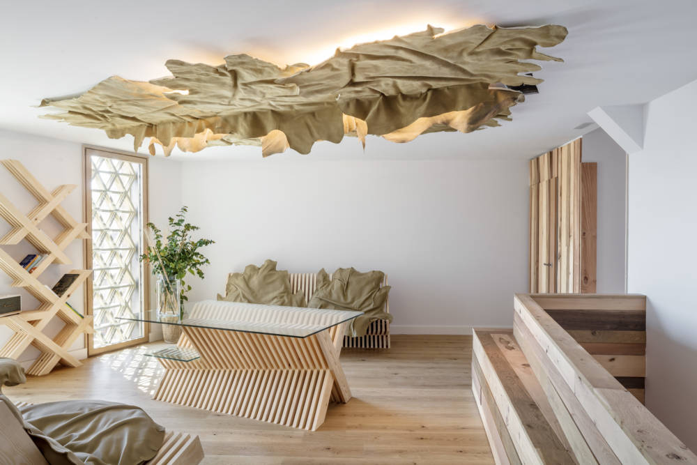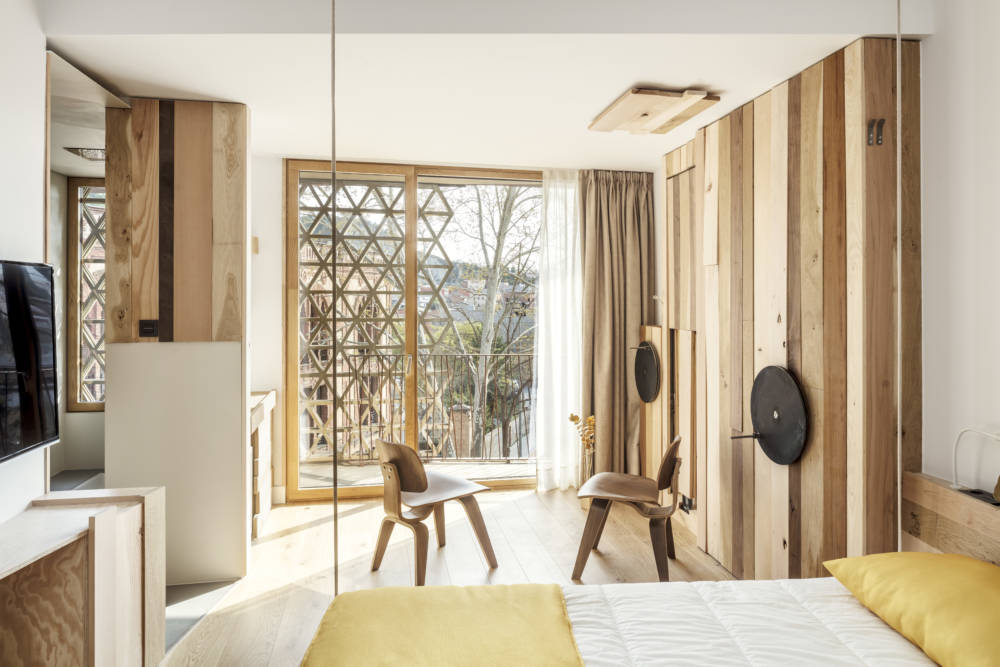 L’hotel compta amb set habitacions dobles, cinc encarades al carrer del Sol (sud) i dues en sentit interior (nord), totes amb una terrassa. Amb la voluntat de convertir l’hotel en molt més que un lloc per dormir, les habitacions estan pensades com una sala d’estar transformable on poder reunir-se, esmorzar, treballar o descansar. Per aconseguir aquesta adaptabilitat, Andrés ha projectat habitacions àmplies amb un llit elevable que, a través d’un mecanisme manual, es pot fer pujar fins al sostre, deixant un gran espai lliure que dona polivalència a les estances. Totes les habitacions compten amb bany propi, un espai que evoca un ambient íntim i tranquil, amb una banyera a nivell de terra, dissenyada pel propi arquitecte.